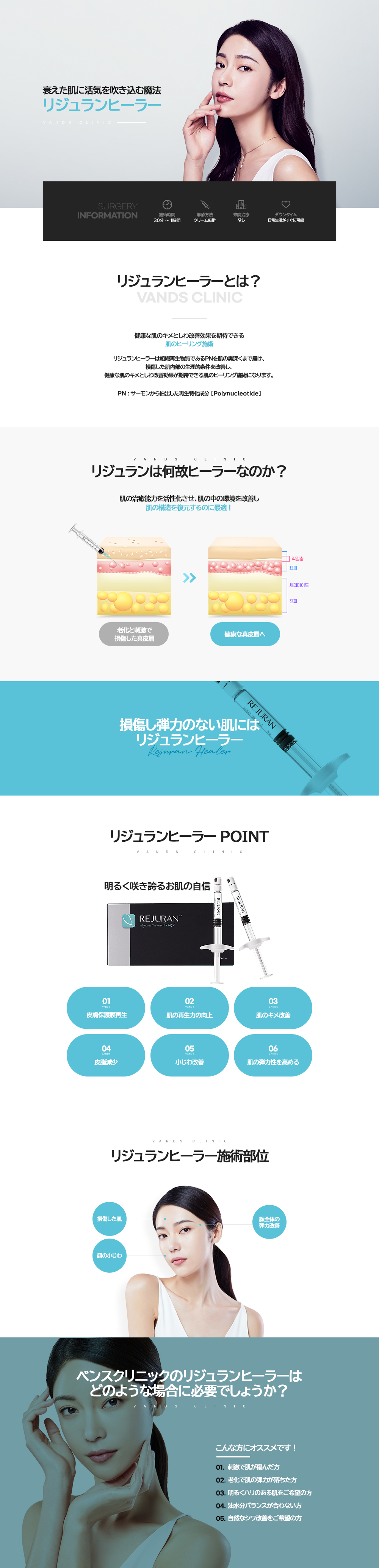 リジュランヒーラーは、生体適合物質であるポリヌクレオチド(PN、polynucleotide)という成長因子複合体で、単純に表皮層に水分を供給するマスクパックとは異なり、薄く伸びた肌の表皮層と真皮層の根本的な再生を通じて肌を健康でハリを改善する施術です。